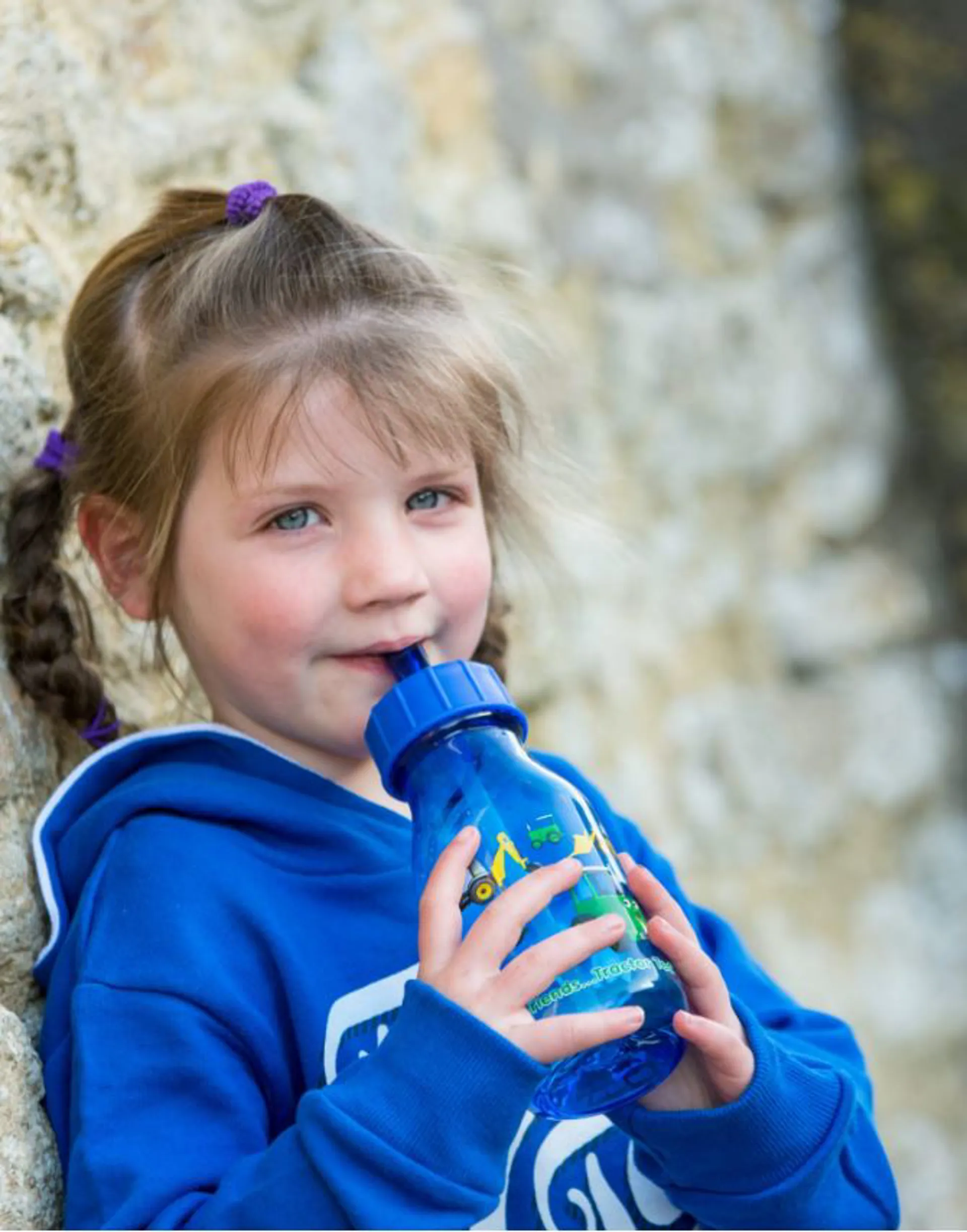The Tractor Ted water bottle comes in two designs; a dark blue colour with digger decal and a light blue colour with farm animal and machine decal.