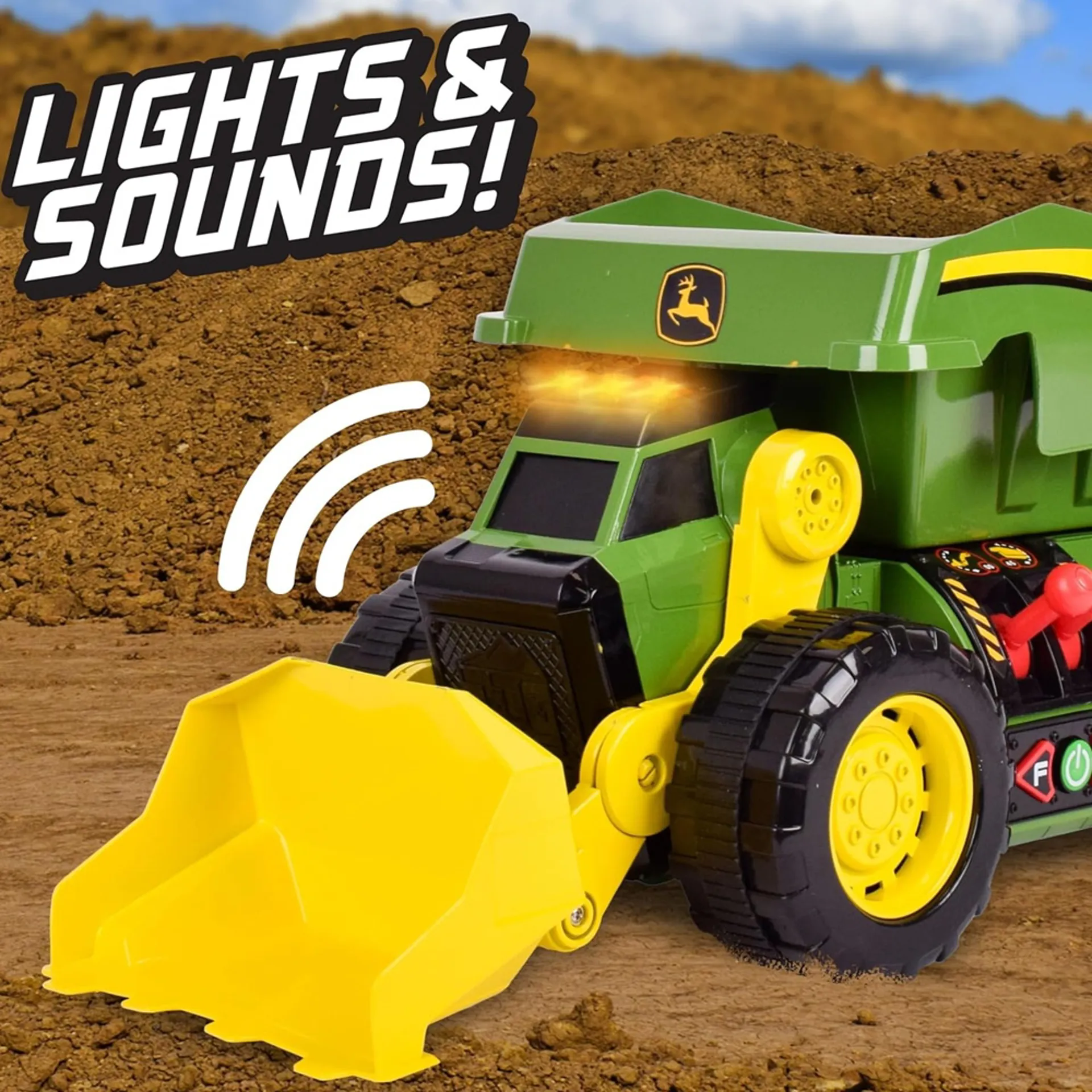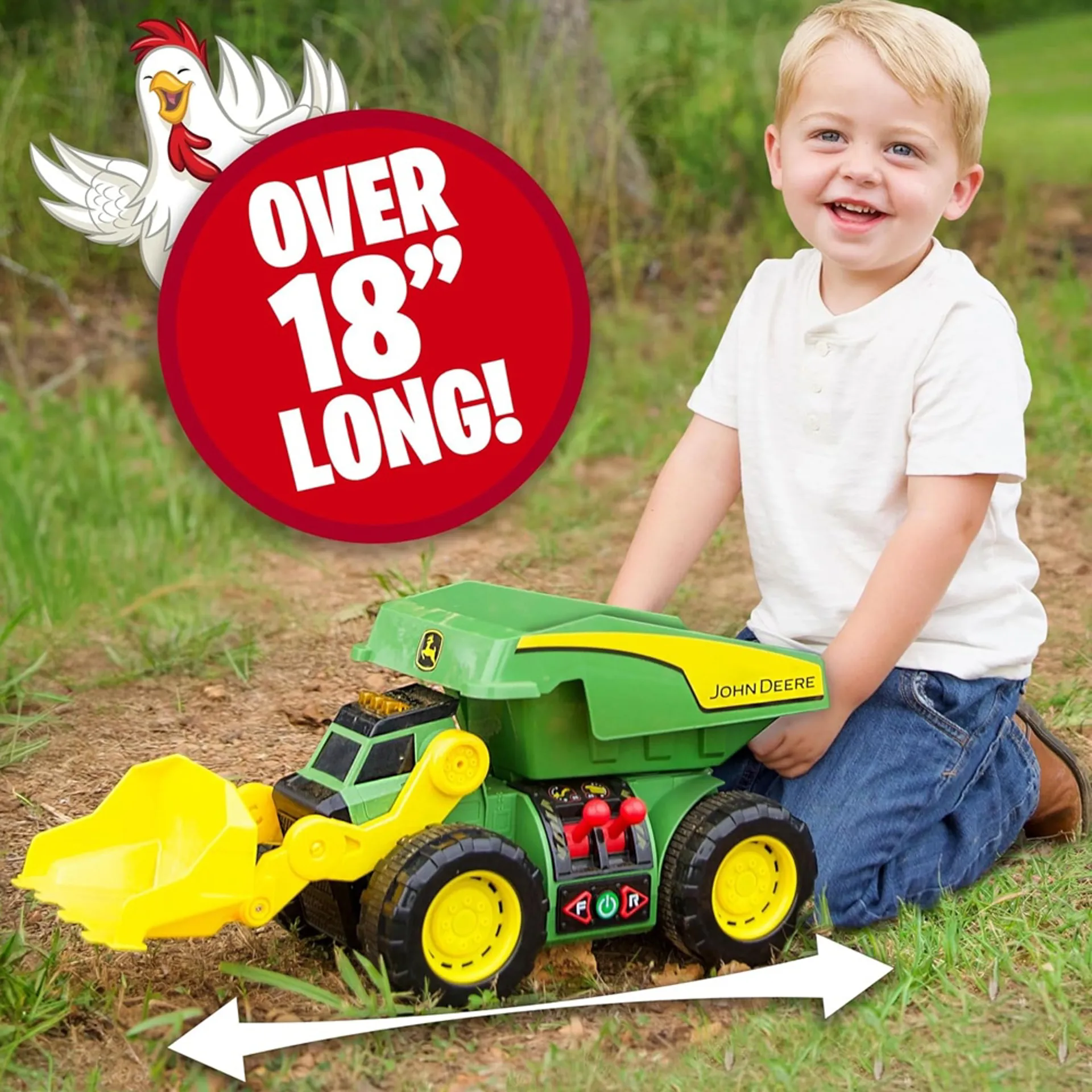 John Deere colours, this extra-large construction truck features a working front loader and dump bed – both controlled by dual joysticks. Scoop up sand, soil or toys, then dump it all out again at the push of a button. Realistic lights and construction site sounds bring the action to life. Measuring over 46 cm long, it’s tough, sturdy and perfect for indoor or outdoor play.Dual joystick controlsLights & sounds2-in-1 dump truck and front loaderSuitable for ages 3+