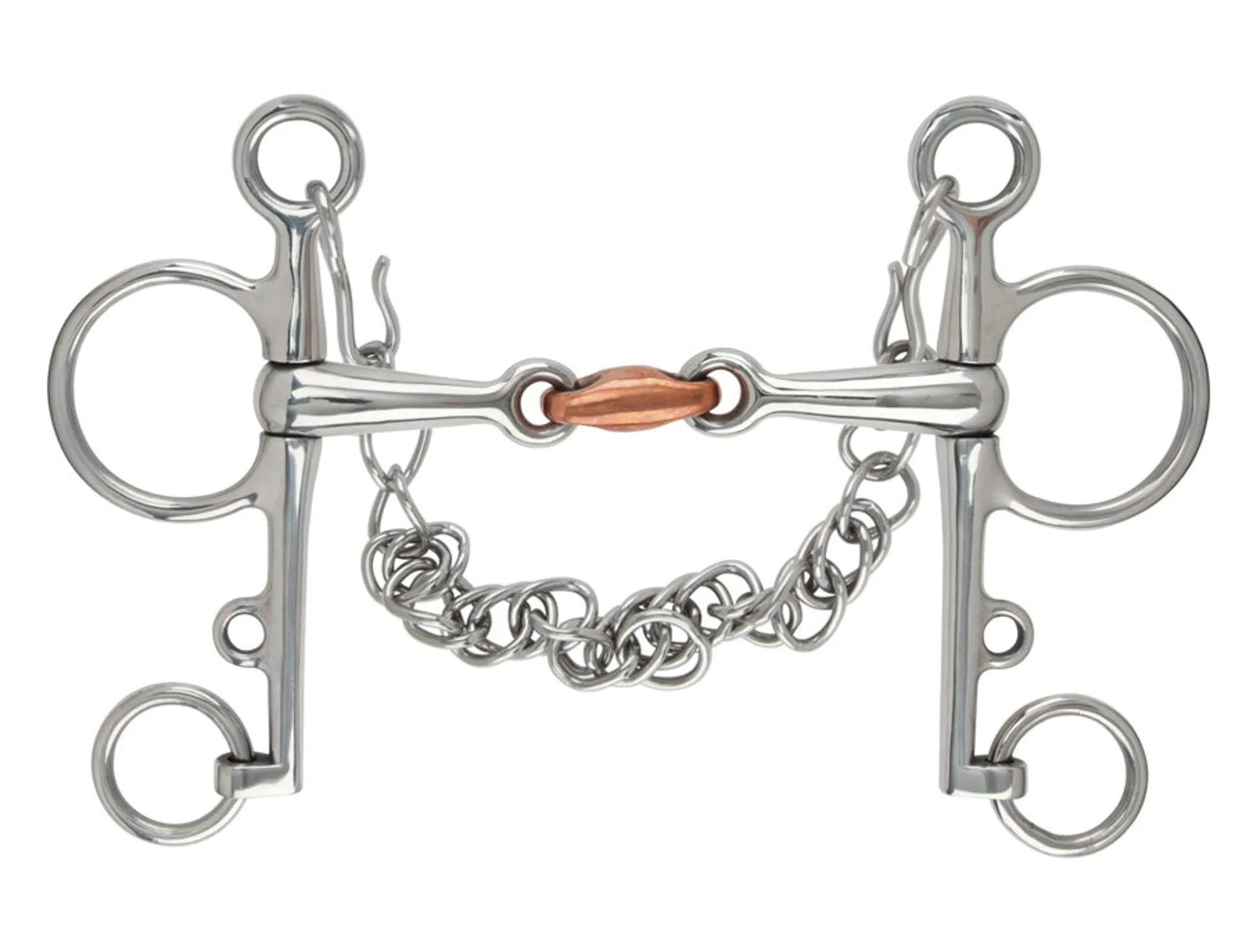This double jointed pelham is often used to help control. The double joint with copper lozenge will soften the nutcracker action and assist with salivation. Mouthpiece thickness: 16mm. Cheek height: 125mm (4.5); 130mm (5); 140mm (5.5). Stainless steel is the most common material for bits. Durable; easy to clean; tasteless and does not rust. Copper is used in the mouthpiece; creating warmth and encouraging salivation to keep the mouth soft